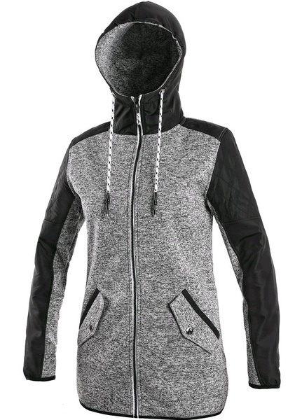 Dámská bunda z pleteniny, prodloužená, kombinace materiálů, kapuce napevno, zapínaní na zip, rukávy zakončeny gumičkou, 2 boční kapsy, reflexní doplňky.