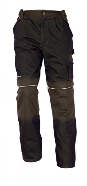 pracovní kalhoty vysoké odolnosti, elastický pas; kovové zipy a druky zapínání; 5 fukčních kapes; zesílená kolena s kapsami na vkládání nákoleníků; reflexní doplňky.