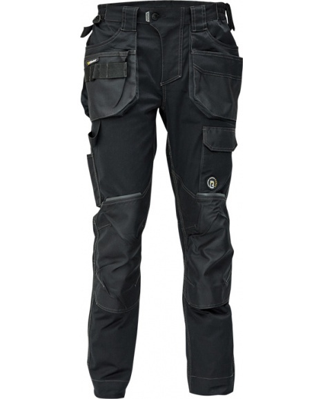 pánské pracovní kalhoty s pružným pasem; elastický inovativní materiál TRIFIBETEX®; odolné trojité prošití nohavic a sedu; Oxford 600D zesílení v oblasti kolen s možností vkládání kolenních výztuh; prostorné multifunkční přední kapsy s poutky na nářadí; reflexní prvky v barevném odstínu; nastavitelná délka nohavic.