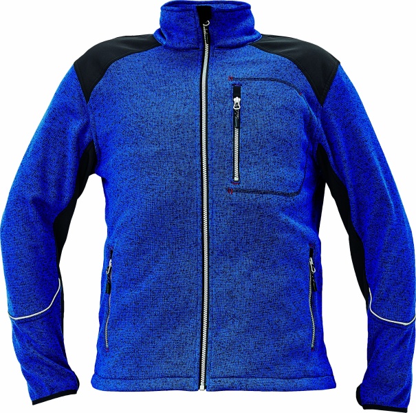 pánská bunda z melírovaného úpletu se zapínáním na zip; zesílená část v oblasti ramen a rukávů softshellovým materiálem; 2 přední kapsy na zip; 1 náprsní kapsa na zip; nastavitelná šíře spodního lemu; očko na palec na konci rukávu.
