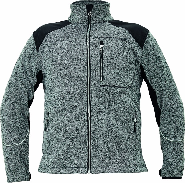 pánská bunda z melírovaného úpletu se zapínáním na zip; zesílená část v oblasti ramen a rukávů softshellovým materiálem; 2 přední kapsy na zip; 1 náprsní kapsa na zip; nastavitelná šíře spodního lemu; očko na palec na konci rukávu.